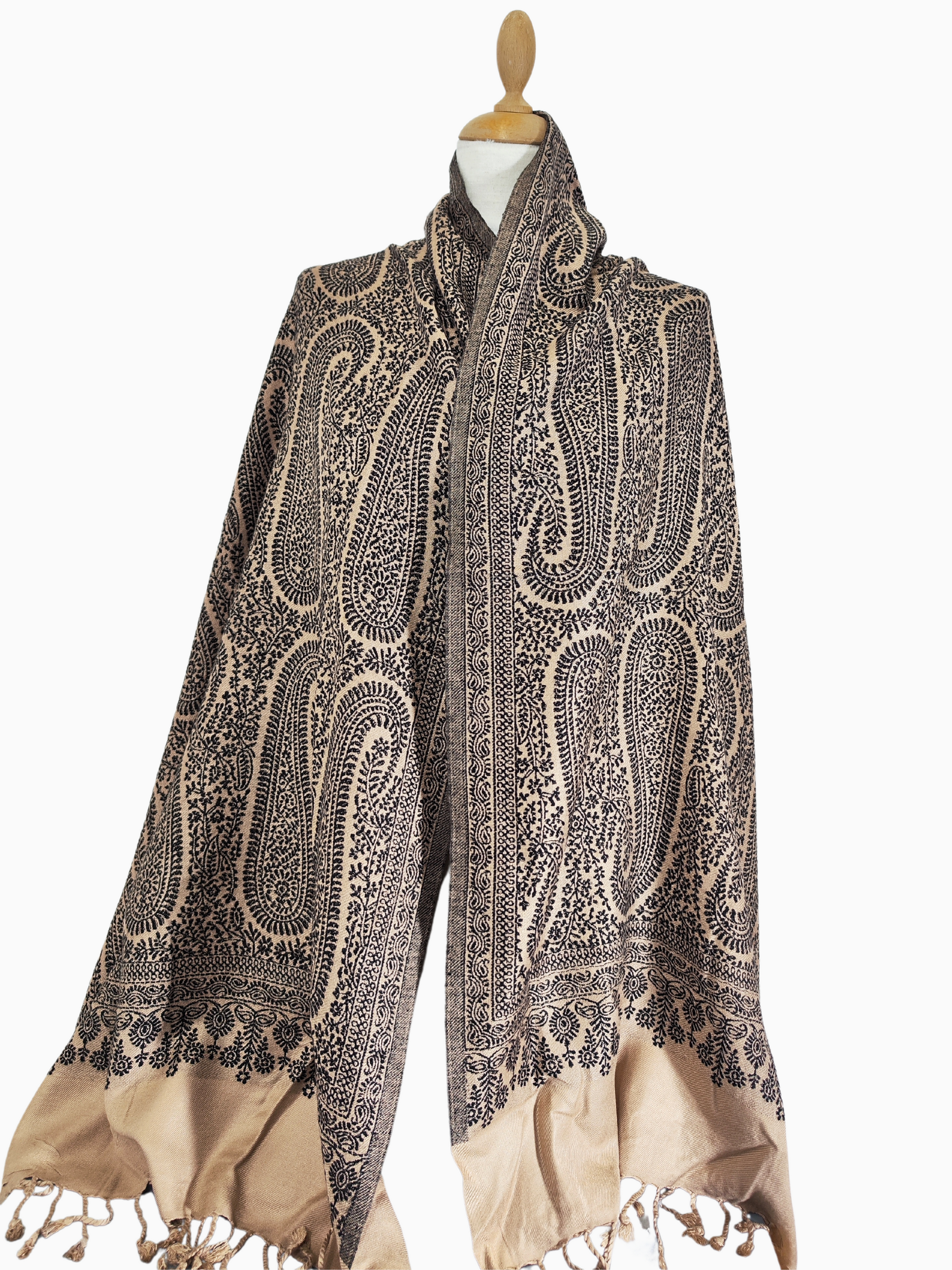 A soft, beige shawl adorned with an intricate dark brown paisley pattern.