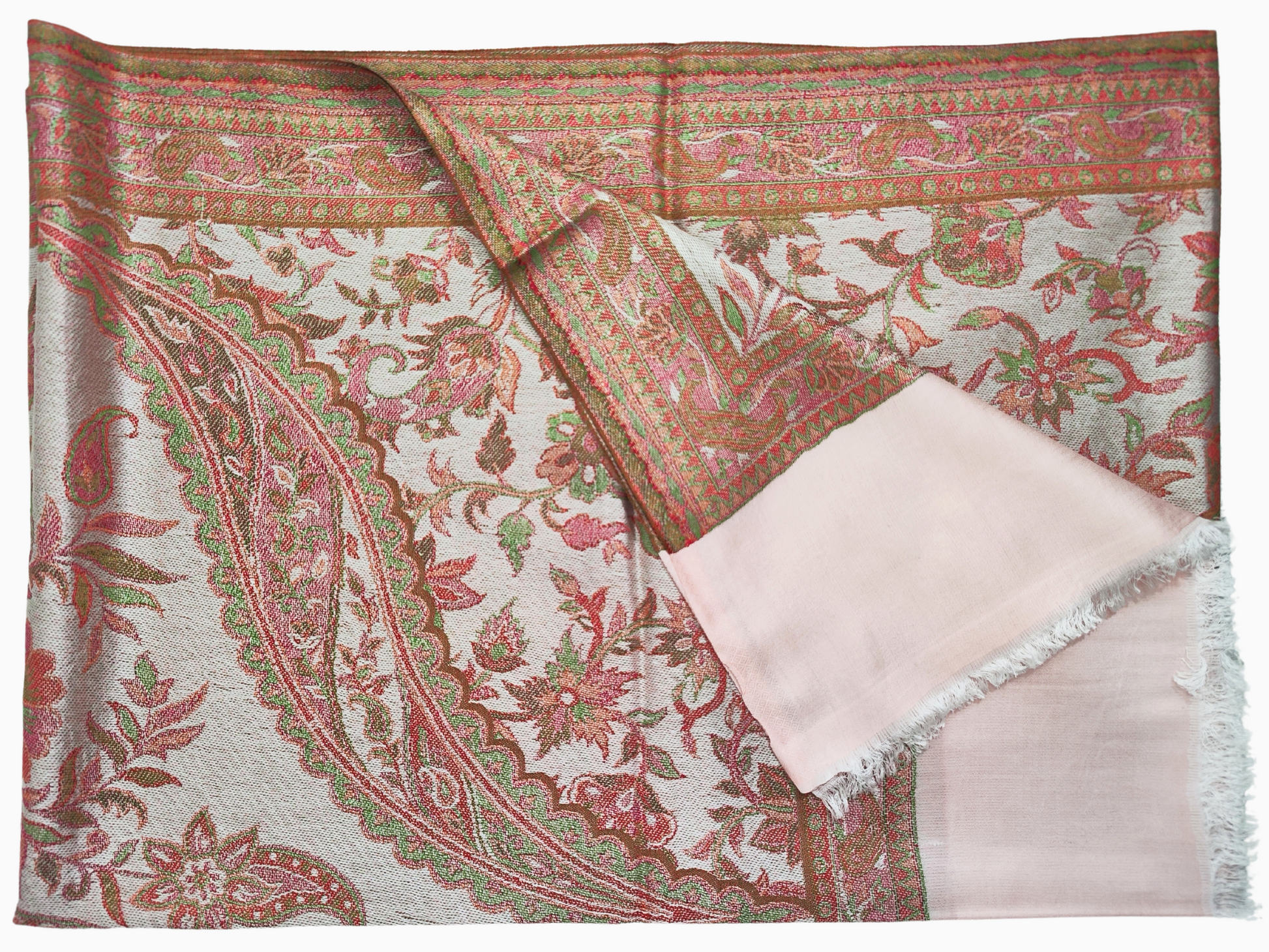 Indulge in the luxury of this exquisite shawl, crafted with intricate paisley motifs in rich hues of pink, green, and gold. Its versatile design allows you to wear it as a scarf, wrap, or stole, adding a touch of elegance to any ensemble.