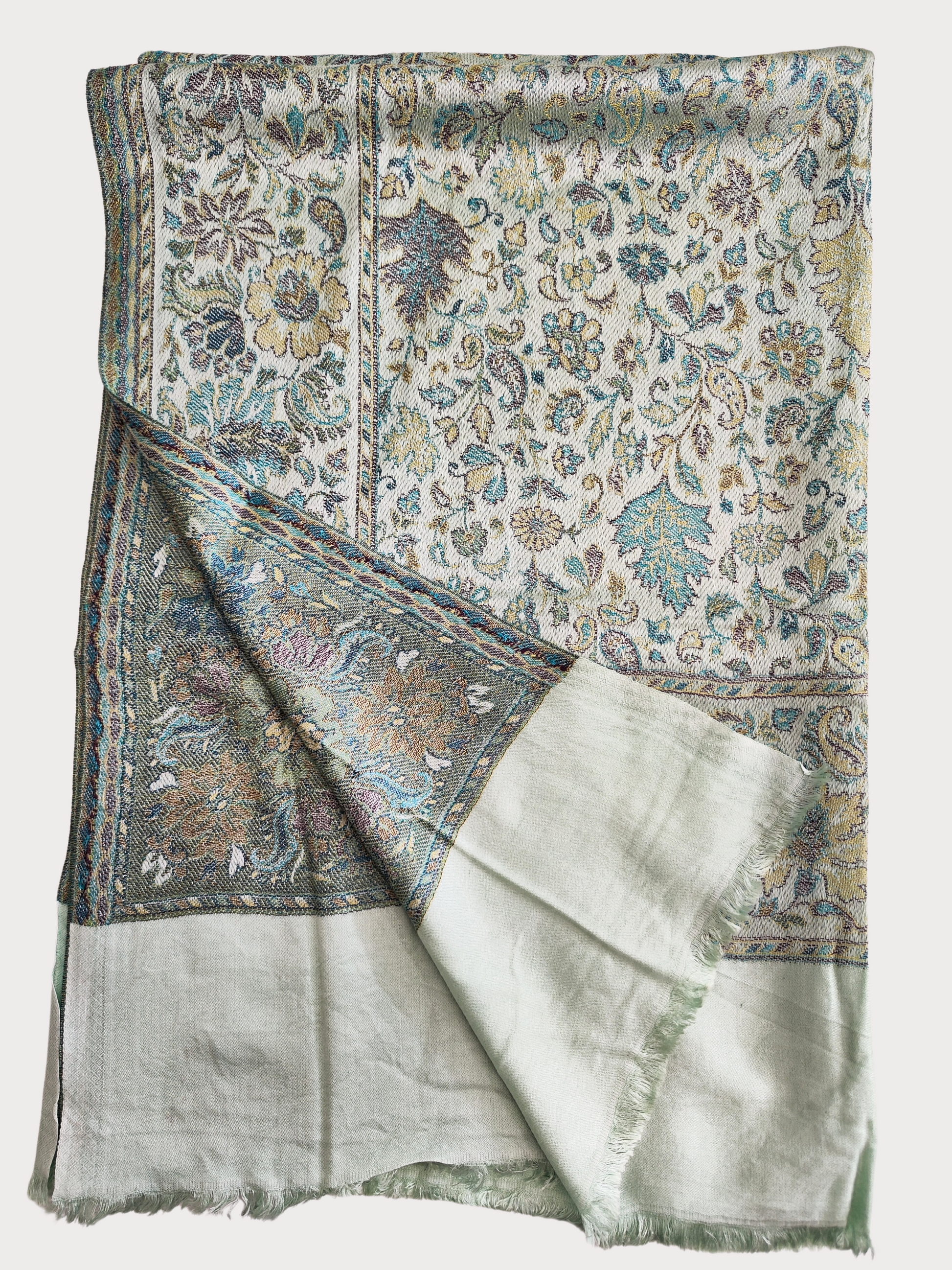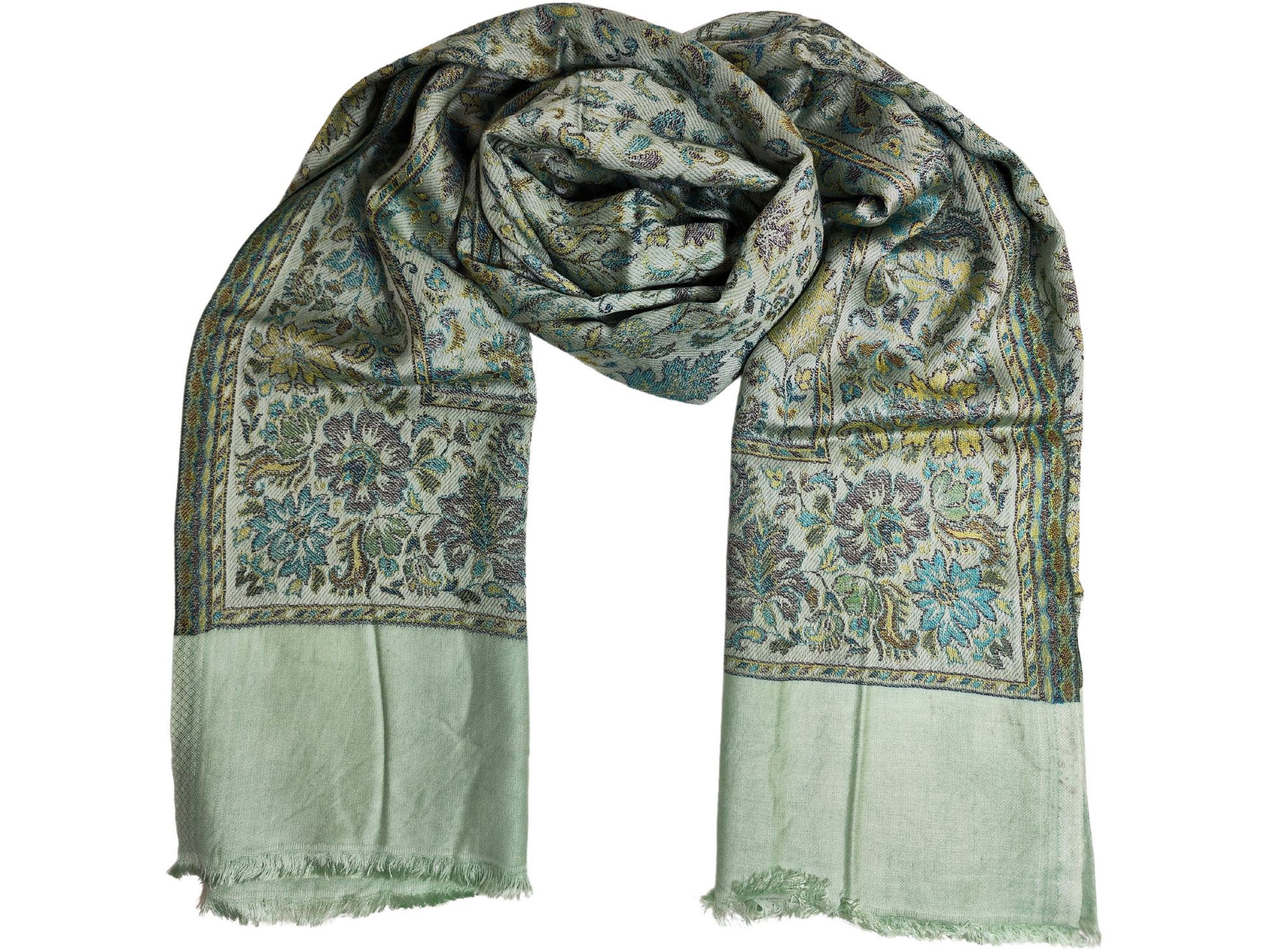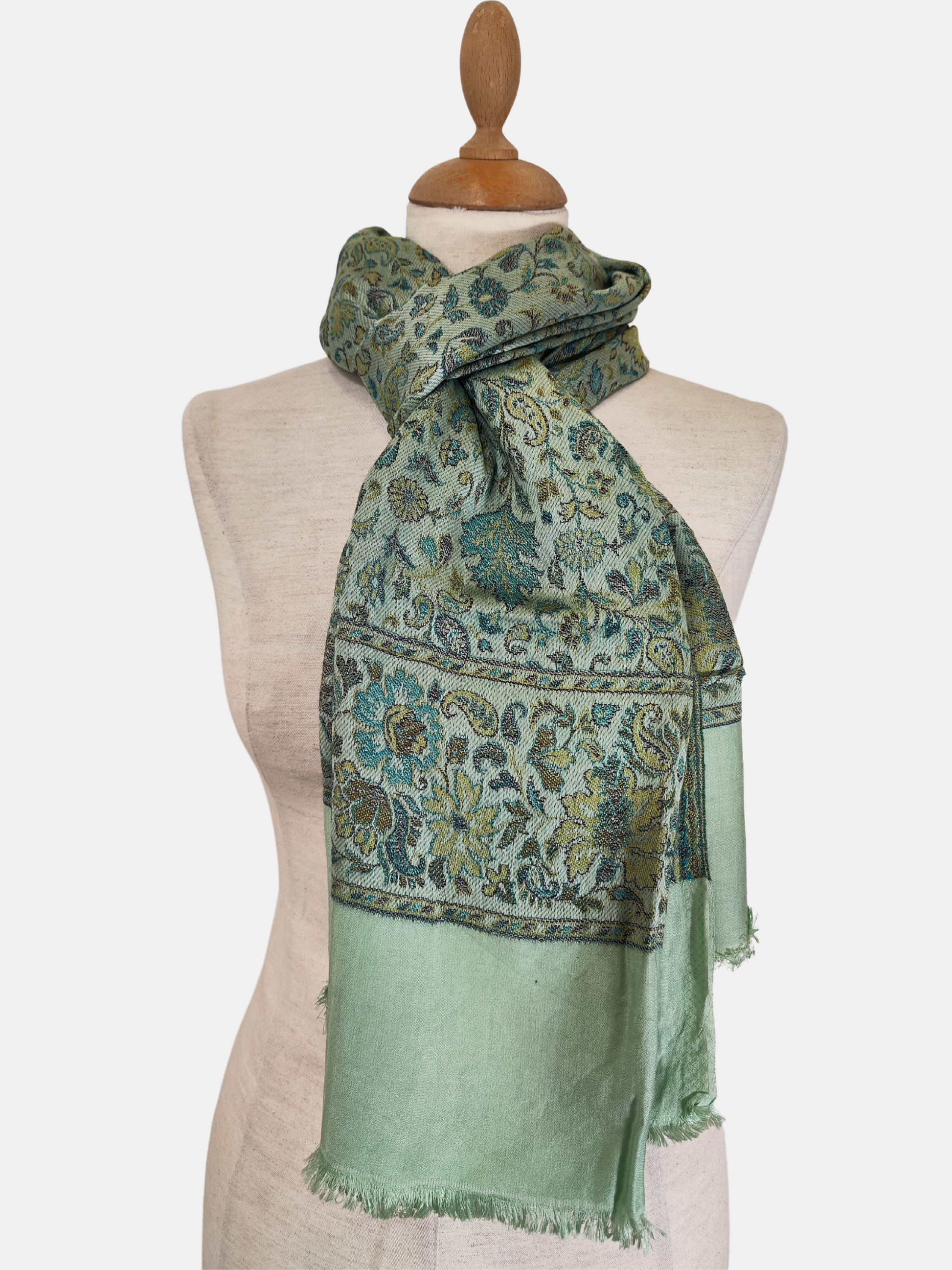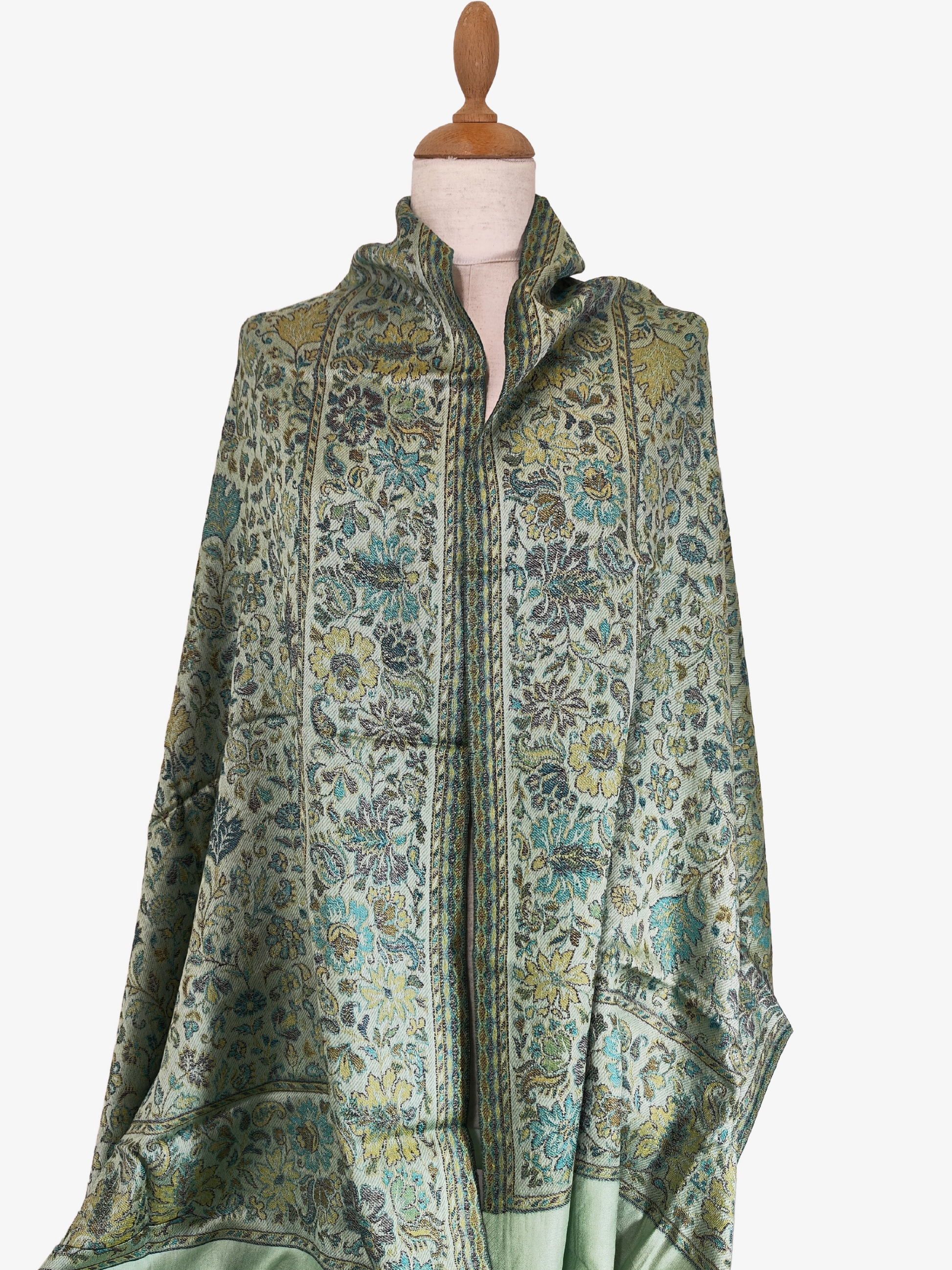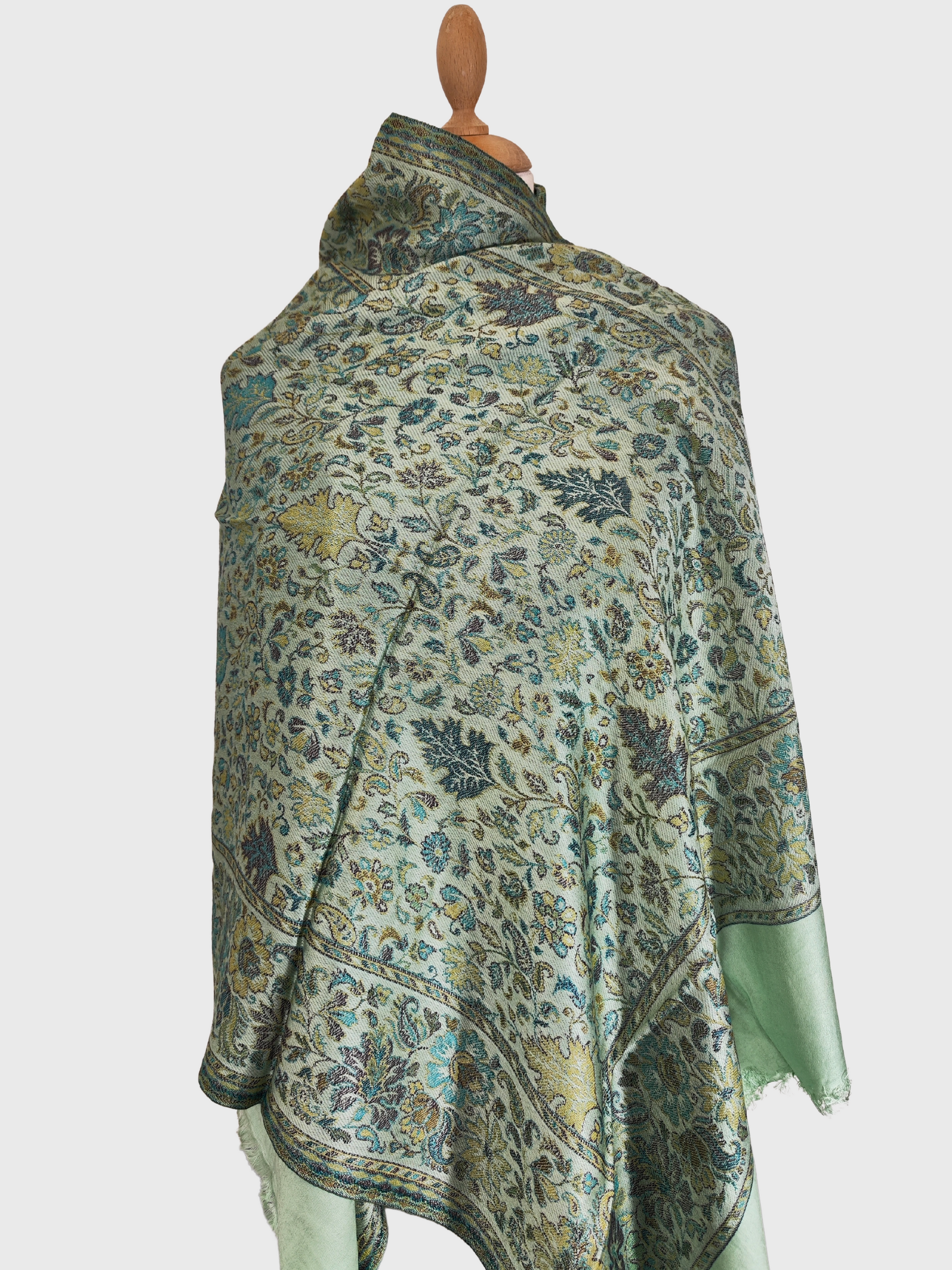 Verleihen Sie Ihrer Garderobe einen Hauch von Eleganz mit unserem Stola-Schal-Wickeltuch aus einer Mischung aus Seide und Baumwolle in metallischem Hellgrün aus unserer Herbstkollektion 2024. Die luxuriöse Mischung fühlt sich weich an und das metallische Hellgrün-Detail verleiht eine subtile und dennoch stilvolle Note.